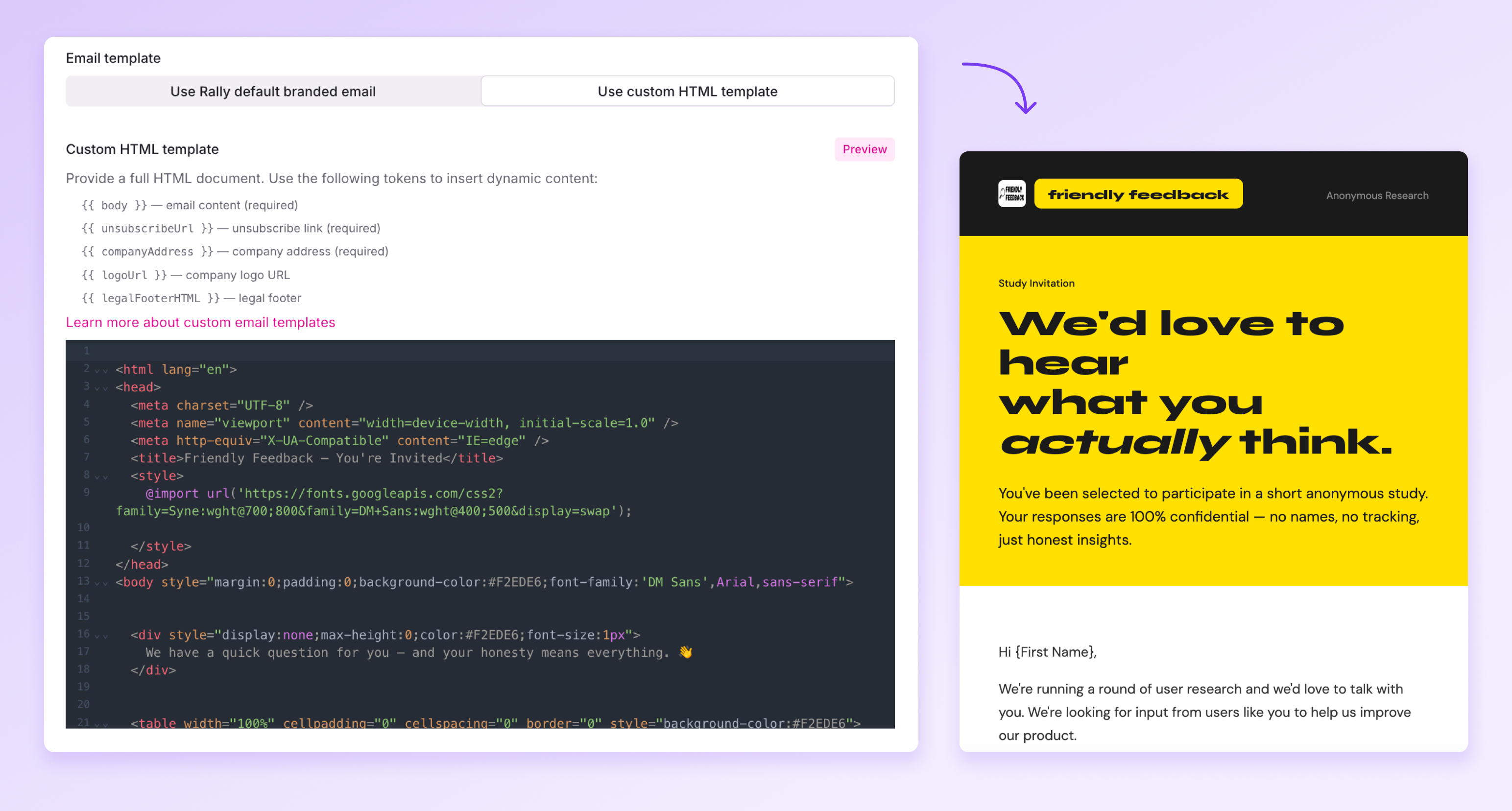This gives teams with strict brand or compliance requirements complete control over how Rally’s emails look to participants and stakeholders. Set up custom branded HTML email templates in Templates > Emails.