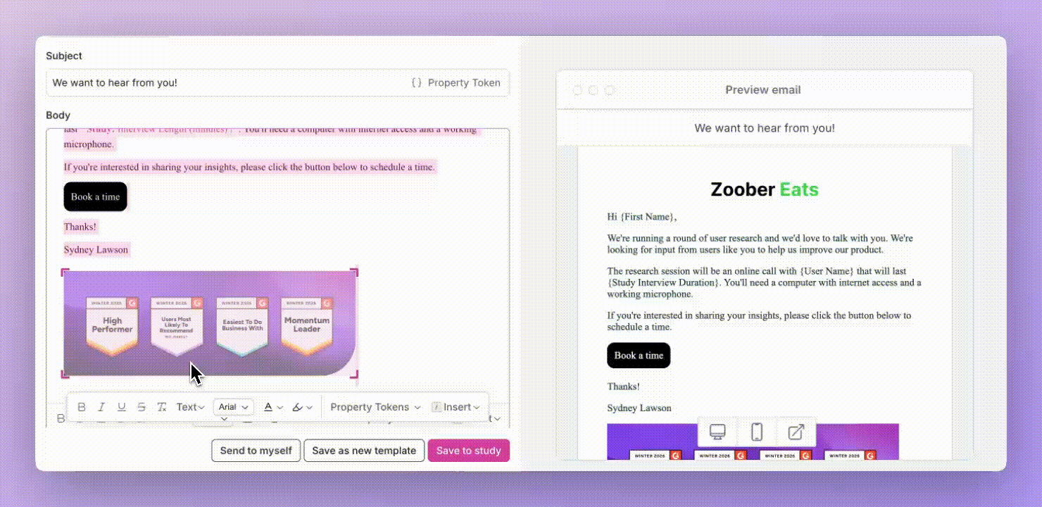 Researchers can now write richer, better-formatted content across all study messages including welcome pages, screener completed messages, and scheduler messages. The rebuilt editor supports inline image resizing, a / shortcut to quickly insert content blocks (text, quotes, images), and a full formatting toolbar.