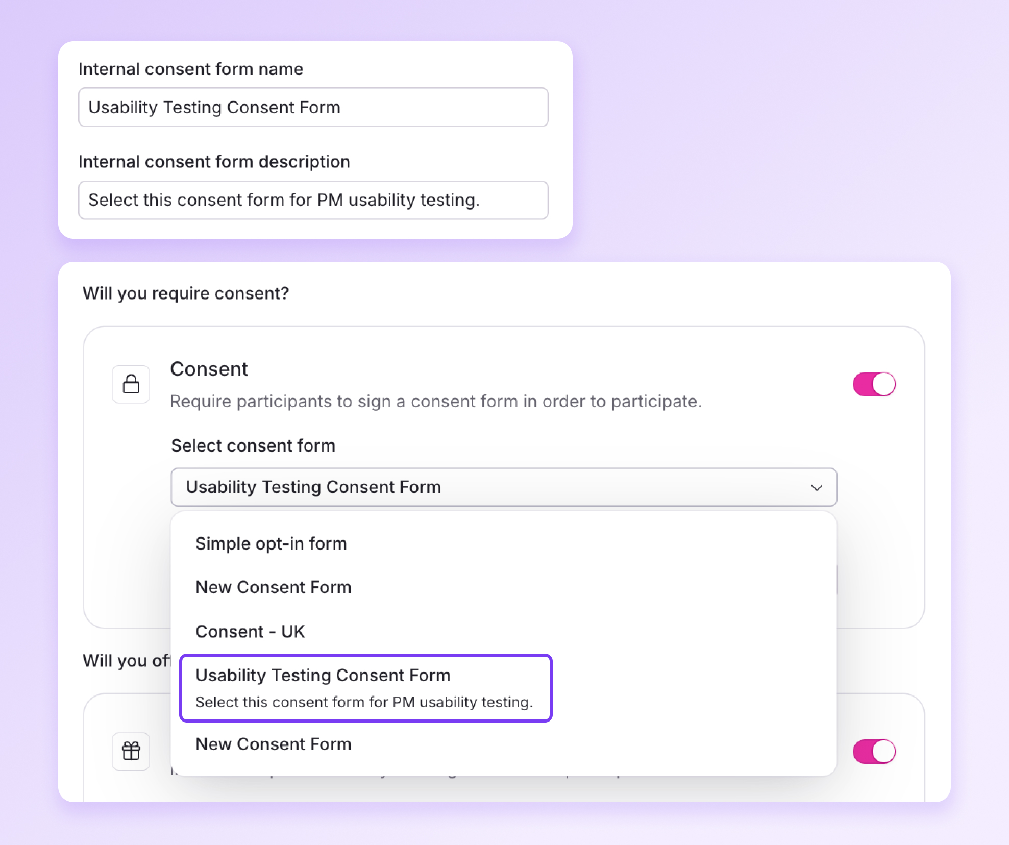 When setting up a study, researchers can see these descriptions directly in the consent form selector so they don’t have to open each form to understand its purpose. This is especially helpful for teams managing multiple consent forms, reducing confusion and the risk of selecting the wrong one.