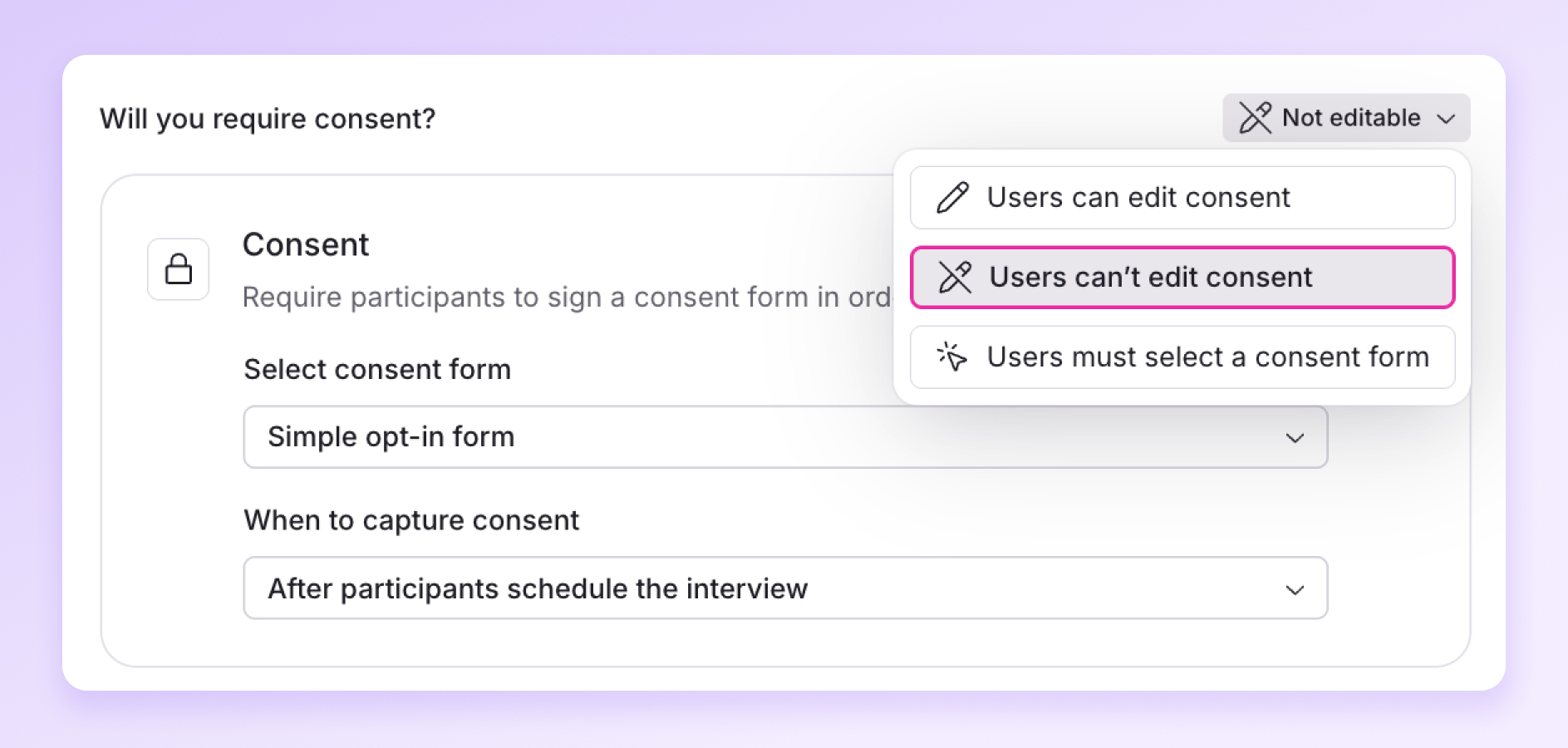 Admins can now lock specific elements of a study template, including screener questions, consent forms, incentives, participant limit, and interview duration, so that anyone building a study from that template can't change what's been locked down. This gives research ops teams a reliable way to enforce standards across their programs without relying on researchers to remember the rules.