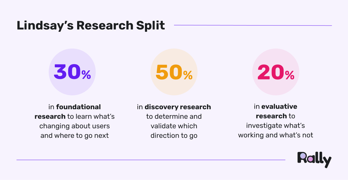 In her new role in product leadership, Lindsay said she’s excited to lead from a product perspective and from a senior leadership level. As her team and org grows, Lindsay’s had to reevaluate their working model. Previously, the team worked in a centralized model, working on whatever was most important. “It helped get the work done, but it didn’t allow our researcher to go super deep in their areas.”