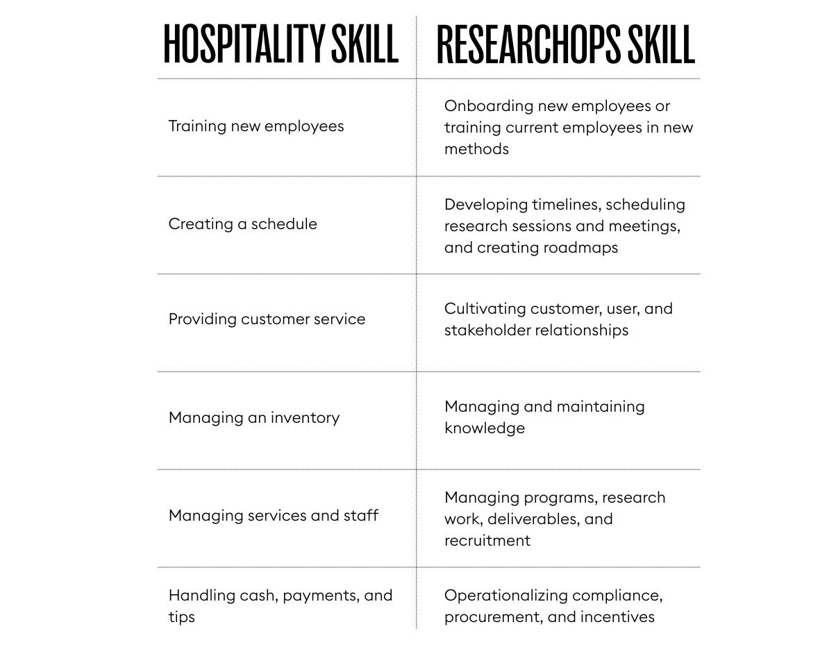 Let’s start with skills because, know it or not, you already have them! If you’ve ever handled reservations, inventory, schedules, service times, side duties, cash tills, tip pools, and many, many more daily hospitality duties, then congratulations, you already have plenty of research operations skills! You can apply those skills to common Research Ops processes: learn how to make and manage meetings, explore the free version or YouTube tutorials of common tools, and sign up as a participant to User Research websites to see the process.