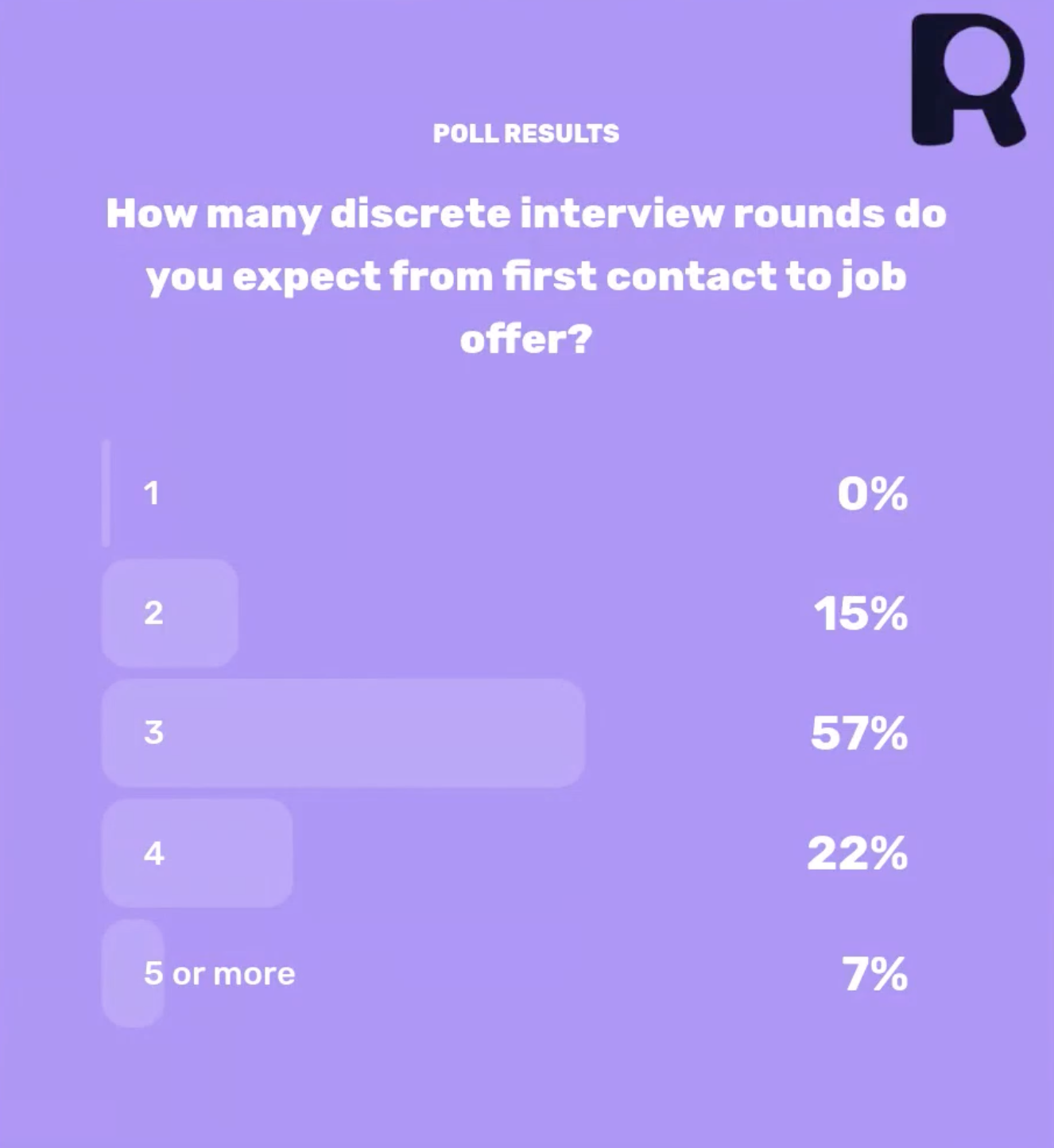 With our research, Thomas and I wanted to better understand the disconnect between hiring managers and job seekers. Both hiring managers and job seekers likely have their own incentives in this process and we wanted to discover those and learn why the two parties are not aligned. For example, hiring managers may be invested in having a really long interview cycle because it reduces risk for the company. Meanwhile, a job seeker is going to want to get a role as quickly as possible and would often prefer a shorter hiring process. In our original research, 60% of those surveyed – both hiring managers and job seekers – wanted three-round hiring processes, quite similar to the results of this live poll.