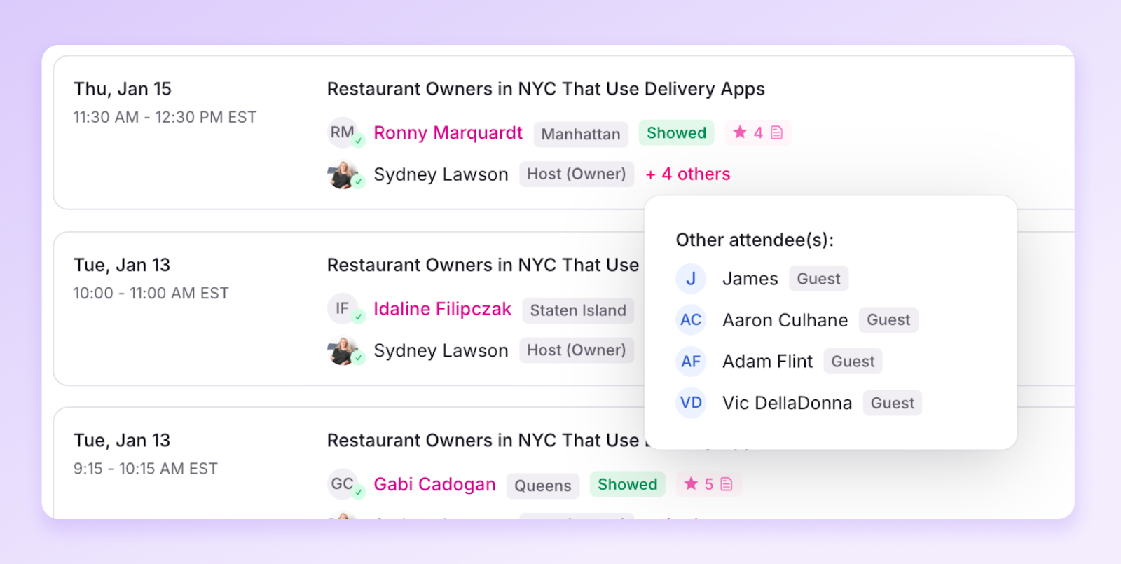 Interviews clearly show attendance status, calendar acceptance, and host versus guest roles. These are small details, but they add up quickly when teams are running multiple studies each week.